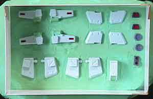 まずは、複製するパーツを、キットから取ります。 (フロントアーマー・リアアーマー・D19・E18 ・E9・E12・ショルダーアーマー:GMカスタム G23×2:GMクゥエル) ただしD19は、E18の接着面をプラ板で、 塞いでください。 後で取れるようにしましょう。 ショルダーアーマーのD15とD16は 複製しませんので、取り外して下さい。 D12は取り付けてください。 |