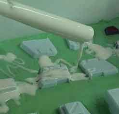 次に混ぜ終わったシリコーンを、原型に 流し込んでいきます。 流し込む時に注意する点は、 一度に多くの量を流し込むのではなく 少しずつ棒の先ぐらいに水あめの様に 巻きつけて糸状にして原型に 流しこむ様にしましょう。 作業中に気泡は、出ますその時は 数秒ぐらい時間をずらし気泡を抜き また流し込む、これの繰り返しです。 ゆっくりやれば、大丈夫です。 |